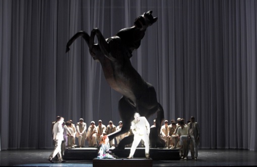 Cualquiera que haya asistido a un ensayo musical de una ópera en un teatro sabe que tiene lugar en una sala, en la que es frecuente ver al coro ocupando unas gradas semicirculares, mientras que los solistas ocupan la parte frontal, van vestidos de calle y acostumbran a no dar los agudos de sus partituras. Esto es exactamente lo que ocurre con esta producción. El único momento en que el coro deja las gradas y está en el escenario es en el segundo acto, mientras Rigoletto canta lo de cortigiani, vil razza damnata. No hay más elementos de escena en toda la ópera que una silla de ruedas, que lleva con él Sparafucile sin que se sepa para qué, y que es donde matan a Gilda, vestida de novia y – oh, sorpresa – su padre no la reconoce y eso que no está metida en un saco. Aparte de esto en la vendetta aparece un enorme caballo de bronce que traen los figurantes y que me temo que se equivocaron en la ruta del circo. Tampoco Gilda se muere en escena, sino que se va, aunque que con el vestido muy manchado, porque a Maddalena se la va la mano echándole no pintura roja, sino negra.