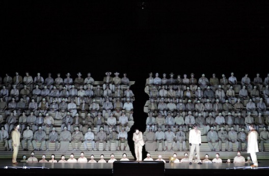 Efectivamente, tras los fastos de la Arabella del día anterior, llegamos a este Rigoletto mediocre, lastrado fundamentalmente por una producción escénica lamentable. La citada producción se debe al húngaro Arpad Schilling y se estrenó aquí mismo en Diciembre de 2012. Tuve ocasión de verla o sufrirla en el Festival de Julio de 2013 y mi opinión no cambia respecto de lo dicho y escrito entonces.