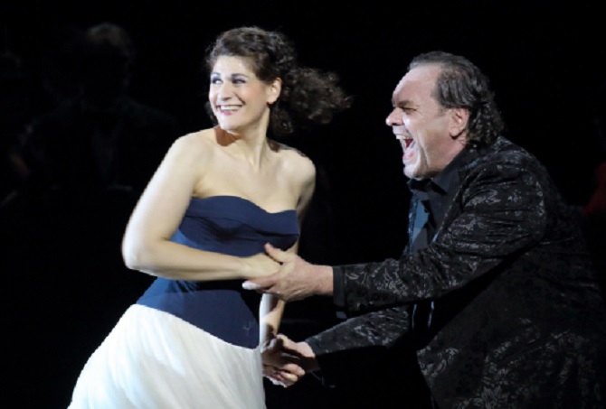 En el trabajo del húngaro no hay una idea, un relato coherente, ni siquiera algo atractivo para los sentidos. En mi opinión calificar de representación escénica a este Rigoletto es una burla. Les aseguro que he visto muchas óperas en versión de concierto en las que la acción escénica era más importante y coherente. Este Rigoletto casi no llega a ser una versión de concierto. Hay que empezar por decir que en el programa aparecen en la lista de créditos el nombre de Marton Agh como responsable de escenografía y vestuario. No hay tal. Toda la escenografía consiste literalmente en dos graderíos, en los que se sientan los coralistas y figurantes durante una buena parte de la ópera, todos inexpresivos y con antifaces blancos. Incluso en el rapto de Gilda los secuaces del Duca siguen sentados en sus gradas. El vestuario consiste en ropa de andar por la calle, vaqueros para Gilda, una chaqueta de punto para el Duque y un traje de verano para Rigoletto, que aquí no es jorobado. La iluminación de Christian Kass no pasa de ser la que puede esperarse de una versión de concierto. Si alguien piensa que exagero, les diré que los artistas cantan sus arias y dúos encima de una pequeña plataforma elevada en el frente del escenario, que no es otra cosa que la concha del apuntador.