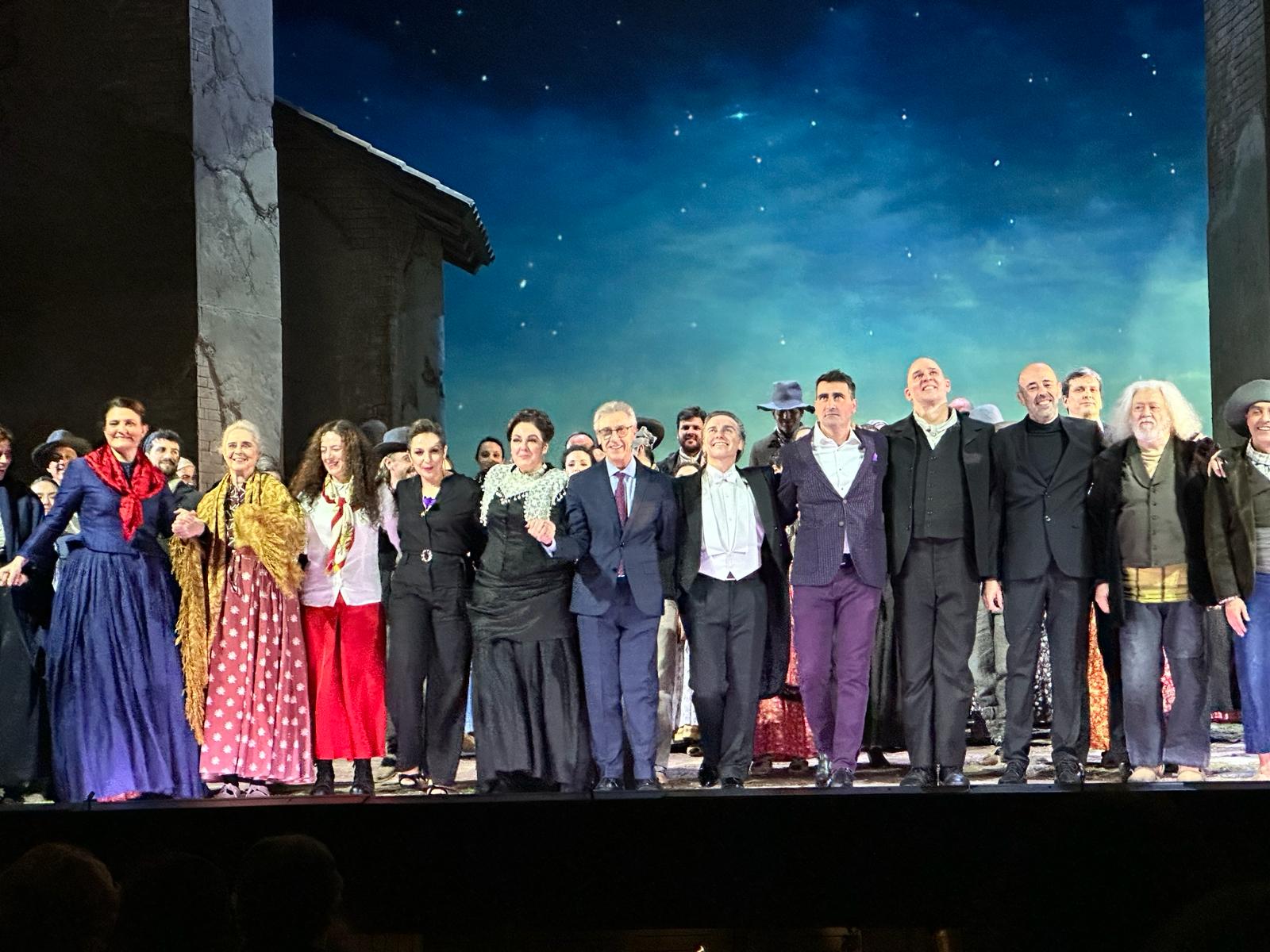 Buen trabajo en el foso por parte de José María Moreno, a veces con batuta y a veces sin ella cuando dirigía a un coro un punto pasado de volumen hasta casi apagar a el vozarrón de Juan Jesús Rodríguez al final de la “Canción del sembrador”. Éste, por cierto, acababa de recibir por la mañana el premio de Opera XXI al mejor cantante español de la temporada pasada. Sin duda uno de los mejores barítonos, con la voz de mayor caudal y timbre de nuestros días y perfecto en el papel de Juan Pedro. Yolanda Auyanet resolvió bien, pero no sin esfuerzo, la mayoritaria escritura para Sagrario en las zonas grave y media grave, con el problema de los repentinos agudos sin preaviso alguno. Muy buen nivel en todo el resto del reparto hasta en Elena Aranoa como cantante de música popular y una mención especial a la profesionalidad y buen decir de Mario Gas como Don Generoso.