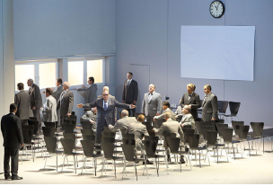 Vayamos por partes. El segundo acto se abre con Paolo vertiendo un veneno en el agua para asesinar a Boccanegra y así lo hace también Tcherniakov, pero parece que a Paolo se le va la mano con los polvos que echa en el vaso de agua, ya que el aspecto era tan repugnante que el Doge no bebe el agua, aunque diga que el sabor le parece amargo. La escena final resulta particularmente rechazable. Siempre el mar ha sido parte importantísima en esta ópera, pero aquí no existe y lo de la marina brezza, il mare, il mare resulta superfluo. La muerte de Boccanegra no sabemos bien por qué ha sido, ya que el veneno no lo ingiere. Más parece que ha perdido la cabeza, ya que no tiene mejor idea que calarse un gorro de papel de periódico en sus últimos momentos para, supuestamente, morir simplemente saliendo del escenario, después de haber hecho que el coro entre en el mismo. Lo que no cabe duda es de que Tcherniakov tiene mucho interés en que el espectador siga la trama y nos ofrece al arranque de cada acto un resumen de lo acontecido y por acontecer, aunque, eso sí, a su manera.