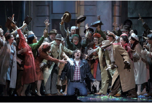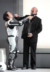 Se trata de una coproducción de la Bayerische Staatsoper y la English National Opera, que se estrenó hace dos años en Londres. Tcherniakov trae la acción a tiempos modernos, situando el Prólogo en los años 60 y la ópera propiamente dicha en tiempos más recientes, quizá en los años 90. Como es habitual, el regista ruso ofrece su propia visión de la ópera. En el Prólogo asistimos a un enfrentamiento de dos bandas rivales, siendo Boccanegra un borrachín con chupa de cuero, que entra en la casa de Fiesco, se encuentra con su amada María muerta y se la lleva a la calle, convirtiéndose el cadáver en objeto de empujones entre unos y otros. Por cierto, la tal María no muere de enfermedad, sino que se abre las venas, a juzgar por cómo tenía los brazos de sangre la pobrecilla. Tras el prólogo, Boccanegra se convierte en un señor respetable vestido de gris, mientras que Fiesco oculta su identidad como sacerdote. Amelia es una chica moderna y gótica, único recuerdo de la época histórica en la que la obra se supone que transcurre. Gabriele Adorno va siempre vestido de motero con buzo blanco y negro y con el casco correspondiente. Si uno se olvida de la historia de güelfos y gibelinos y procura centrarse en un enfrentamiento entre bandas mafiosas rivales, la cosa no está mal, salvo que en más de una ocasión el libreto chirría.