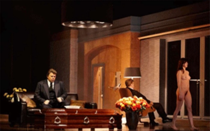 En el primer acto Graham Vick no tiene mejor idea que tener siempre en escena a Tristán, aunque no canta hasta el final, y también al Rey Marke, éste sentado en una butaca, de la que se levantará en los últimos compases para recibir a la Princesa de Irlanda. ¿Qué significado tiene una joven desnuda deambulando por la sala? ¿Por qué hay un ataúd siempre en escena? ¿Qué significa un niño haciendo barcos de papel, a quien se lo lleva fuera la joven en porretas? ¿Qué pinta una joven ataviada con velo y portando una maleta, que se esconde tras el sofá de Tristán? ¿Quién es la viuda de negro que coloca flores en el ataúd? ¿Qué aporta a la historia que la pareja protagonista se inyecte heroína en vena en lugar de beber el filtro de amor? ¿Qué significa en el segundo acto un joven desnudo cavando una fosa? ¿Y la joven desnuda que se pasea por la escena para sentarse en una butaca a ver a los enamorados para retirarse a continuación? ¿Y la misma joven y con el mismo atuendo, pero apoyada en el quicio de la puerta de la habitación, durante la última media hora del segundo acto? ¿Es un hallazgo que Tristán esté recluido en el último acto en una especie de asilo de ancianos, con signos evidentes de Parkinson? ¿Y que Tristán no muera en brazos de Isolde, sino que simplemente se vaya, hasta el punto de cantar su última frase, no en brazos de Isolde sino en interno? ¿Qué profunda idea hay detrás de que aparentemente Isolde no llegue a Kareol, sino que también parece vivir en el asilo? Siempre he creído que Isolde muere de amor ante el cadáver de su amado. Aquí no. Simplemente, Isolde se va, aunque no puedo descartar que quienes le acompañan no sean sino La Santa Compaña.