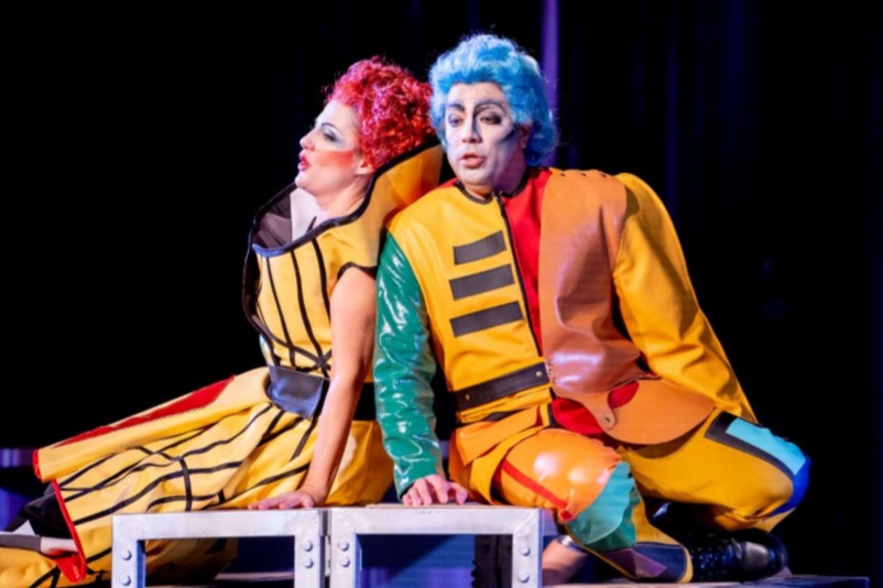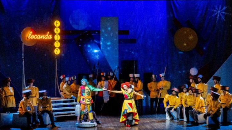 Si el año pasado la producción de Enrico di Borgogna se empeñó en convertir una comedia en un drama, este año la ópera bufa ha sido servida como tal de principio a fin. La producción, evidentemente, es nueva y de la Fondazione Teatro Donizetti de Bérgamo, y se debe a Marco Paciotti y Lorenzo Pasquali, apareciendo también en la regía Ondadurto Teatro. No pretende sino hacer pasar un buen rato y ponerse al servicio de la bufonería de la obra, ofreciendo un escenario a base de elementos móviles, que dan una gran agilidad a los cambios de escena, contando con un vestuario (K.B. Project) un tanto infantil y muy colorista, así como una estupenda iluminación de Marco Alba, con profusión de imágenes. La dirección de escena es buena, siempre al servicio de la ópera y no al revés y se ve con gusto. No es culpa de la producción que la obra pueda hacerse excesivamente larga.