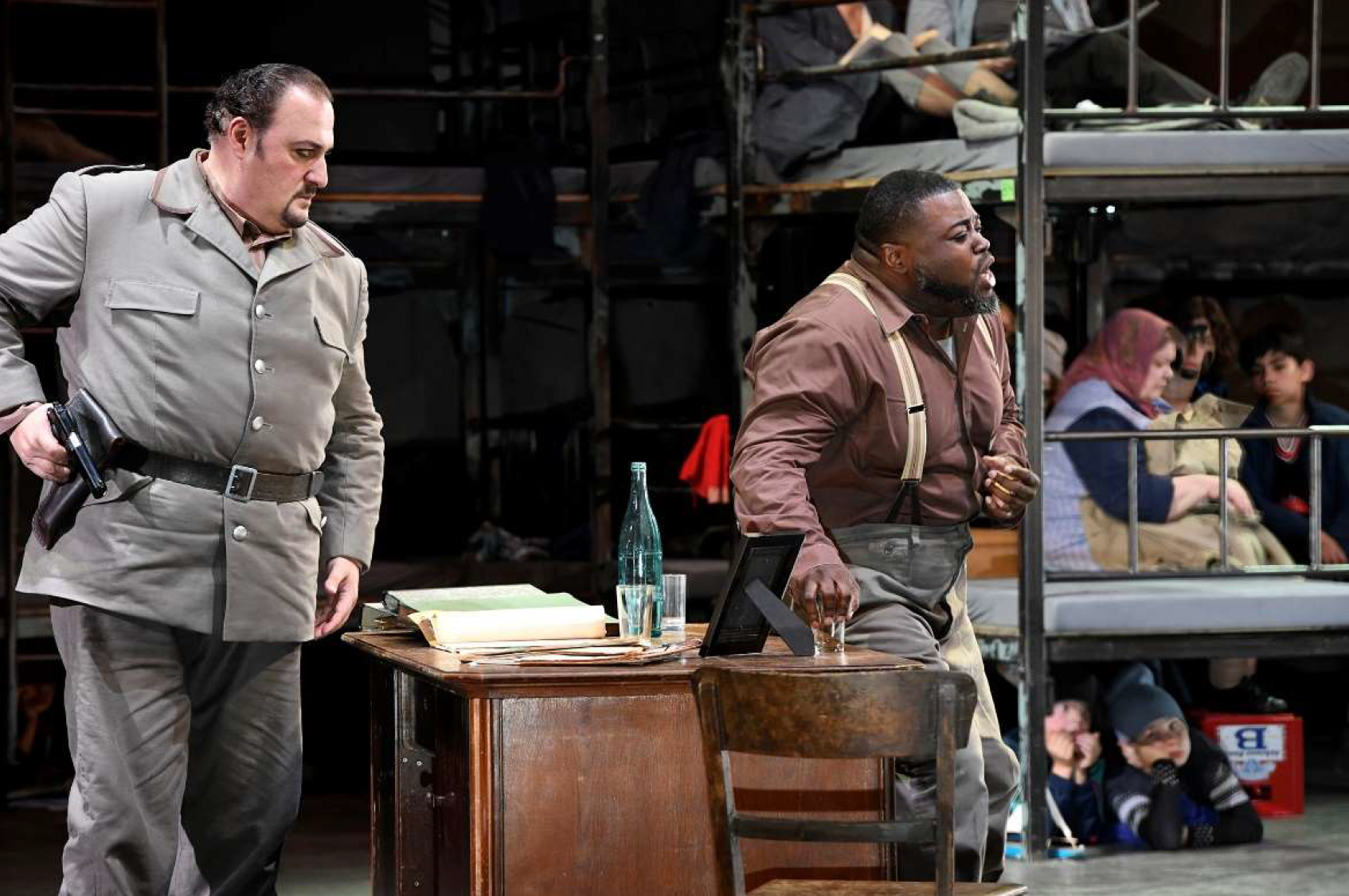 La producción escénica lleva la firma de Andreas Kriegenburg y es la que pudimos ver en el Liceu de Barcelona hace 3 años, habiéndose estrenado en la Deutsche Oper en Mayo de 2010. La verdad es que el trabajo de Kriegenburg más que rompedor es simplemente malo y aburrido. Kriegenburg sitúa la acción en tiempos actuales en un campo de refugiados, que ocupan toda una serie de camastros situados de arriba abajo en el fondo del escenario. La citada escenografía (Harald Thor) es única para toda la ópera, cambiando exclusivamente en el último acto y en el final del primero, que consiste en un gran lecho, que se sitúa en corbata delante de un telón. El vestuario (Andrea Schraad) resulta adecuado para la idea de Kriegenburg y bastante ramplón. Poco interés ofrece también la iluminación de Stefan Bolliger.