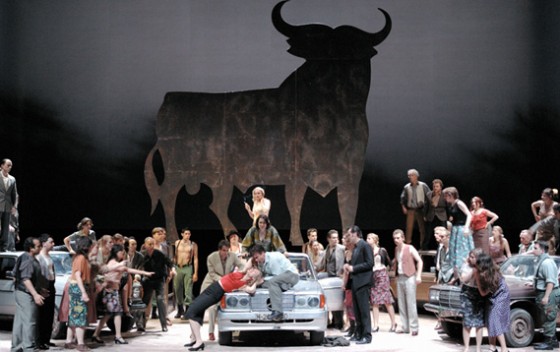 El hallazgo de Bieito fue tomar todos los elementos pintorescos y exóticos del libreto de Ludovic Halévy y Henri Meilhac a partir de la novela de Prosper Mérimée y llevarlos al terreno de la iconografía. Así, los militares se transformaron en soldados de la Legión en un puesto fronterizo que podría ser perfectamente Ceuta. Las cigarreras pasaron a ser poligoneras y los contrabandistas lucieron cadenotes de oro combinado con chándal. En esa revisión, tuvieron un papel igualmente importante la figura del toro de Osborne (derribado y deconstruido en un potente golpe visual) y la bandera de España.