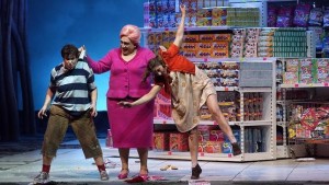 Pelly es siempre ocurrente pero respetuoso con partitura y texto. Sin perder de vista el sentido profundo de la obra, ha sido capaz de darle una vuelta de tuerca a la historia y traérnosla a día de hoy, a este mundo consumista en el que vivimos. Una gran hallazgo convertir la casita de mazapán de la bruja en la gigantesca instalación, abarrotada de alimentos basura, de un moderno supermercado. Una visión ya adelantada al final del segundo acto, en el momento en el que los dos niños se quedan dormidos en el terrorífico bosque, merced al empleo de varias pantallas de televisión que nos ofrecen imágenes muy realistas de rostros devorando todo tipo de chucherías y de grasientas hamburguesas.