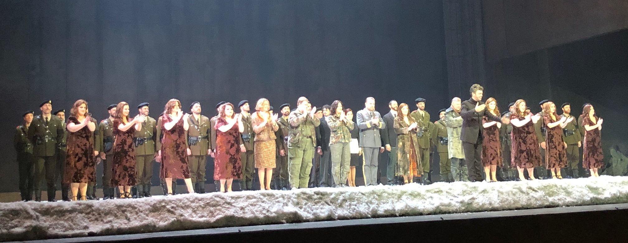 Aire extraño en las butacas que tuvo su correspondencia en la puesta en escena diseñada por Leo Castaldi, con una retícula de líneas rojas que dividía el escenario en cuadrados de dos por dos metros que ‘encerraban’ a los miembros del coro y a los cantantes. Bueno, eso en teoría, pues en la práctica los movimientos de Violetta Valery (Marina Rebeka en esta función inaugural), Alfredo Germont (Michael Fabiano) y el padre de éste (un excelente Artur Rucinski, que se llevó la mayor ovación del segundo acto) cruzaban esas líneas rojas. Eso sí, siempre con la distancia de seguridad dos metros: así, la flor que Violetta entrega a Germont se materializa a distancia en las manos de éste, igual que cartas y otros objetos. La música, manejada desde el foso con brío por Nicola Luisotti, intenta eliminar la separación y hacer posibles los abrazos a lo lejos entre los protagonistas. El hecho de que no haya ninguna ópera más representada en todo el mundo que ‘La Traviata‘ y que ésta sea prácticamente un ‘grandes éxitos’ de arias del repertorio operístico contribuyó a alimentar la cercanía.