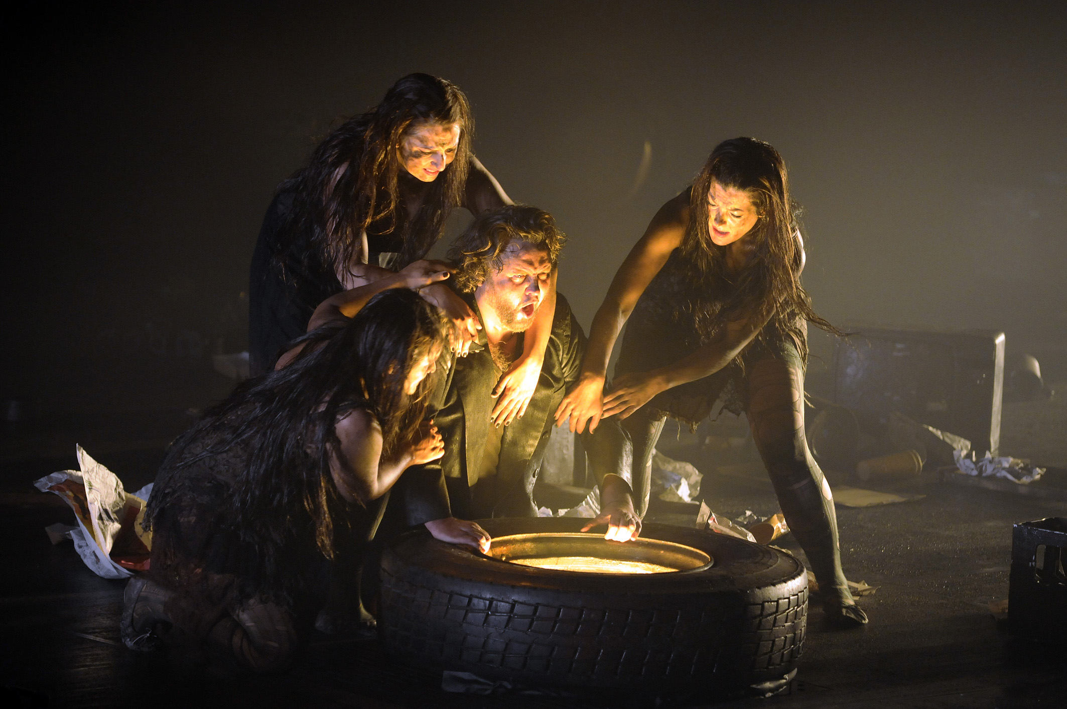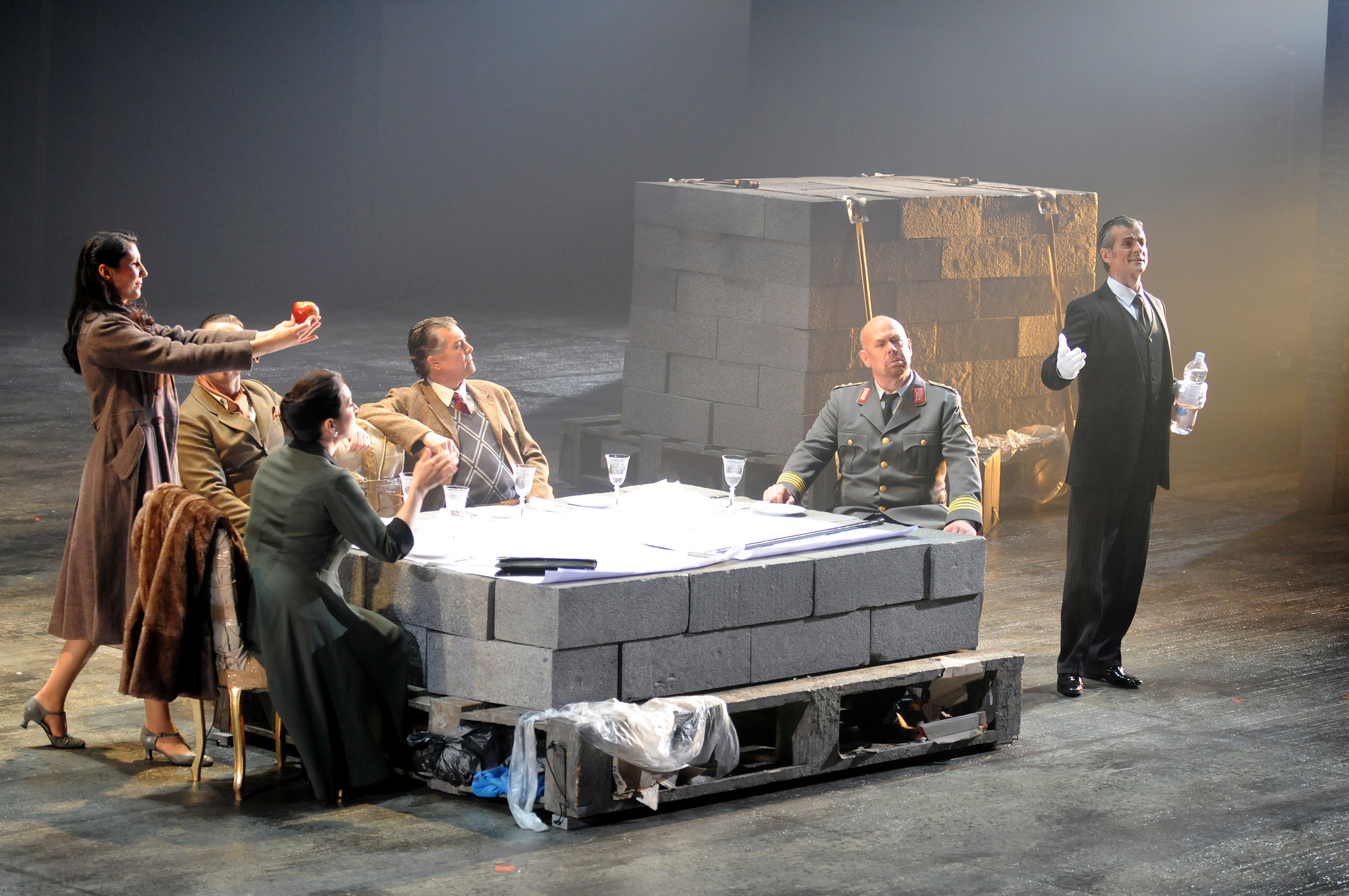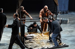 La producción de Robert Carsen procede de Colonia, donde se estrenó en el año 2000. Reconozco que tengo una admiración especial por los trabajos de Carsen, a quien considero uno de los más grandes directores de escena actuales. Sus trabajos pueden ser más o menos rompedores, pero siempre son respetuosos con libreto y música. En esta ocasión el canadiense va por caminos ecológicos, que, seguramente, tendrán mayor profundidad y protagonismo en las siguientes óperas. Ya desde el preludio podemos ver en escena una serie de figurantes paseando por la orilla de un supuesto Rhin, echando lo que les sobra al río, de modo que la aparición de las Hijas del Rhin tiene lugar en un estercolero, que es en lo que se ha convertido el río por obra del hombre. Los dioses no son sino la corte de un dictador militar, cuya grandilocuencia y ansia de poder le llevará a su destrucción final. La idea tiene su fundamento profundo, aunque algunos echen en falta lanzas, armaduras y cuernos.