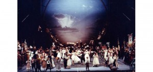 Así que nuevamente he podido disfrutar de la producción de Götz Friedrich, que cumple ya 20 años y es un trabajo escénico realista y muy cuidado en todos sus detalles.  Estamos ante una producción tradicional y con buen gusto, aparte de contar con una buena dirección escénica. La escenografía de Peter Sykora está dominada por un círculo al fondo del escenario, con reproducciones de  monumentos y casas de Nüremberg, que en el primer acto se convierte en un gran rosetón alusivo a la Iglesia de Santa Catalina, donde la acción se desarrolla. En el segundo acto el círculo queda en penumbra y vuelve a aparecer en la escena de la pradera, ya sin el rosetón. La producción esta hecha con buen gusto, sin cambios de época, con un atractivo vestuario (Kirsten Dephoff y Peter Sykora), y destacada iluminación. Es posible que este trabajo no levante grandes entusiasmos hoy en día, pero tiene la ventaja de que no puede producir rechazo en nadie. Los detalles están muy cuidados, especialmente en el segundo acto y en la primera escena del tercer acto. La escena de la pradera está llena de colorido, aunque a veces da la impresión de estar  excesivamente abigarrada, ya que al muy numeroso coro se añade una pléyade de figurantes. Francamente bien resuelta la escena final dela Noche de San Juan y su pelea generalizada. En suma, un espectáculo agradable, muy recomendable especialmente para nostálgicos, aunque en nadie puede producir rechazo.