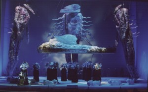 Sigue el mismo equipo artístico para todo el Anillo. La producción se debe a Valery Gergiev y George Tsypin, siendo éste el autor de la escenografía. En esta ocasión se vuelve a un escenario desnudo con la presencia de las figuras megalíticas a las que me referí en el Oro del Rhin. Tres de estas grades figuras forman la casa de Hunding, coronada con un enorme bloque de piedra. En el segundo acto vuelven las mismas figuras, con la gran piedra en la parte de abajo. Finalmente, en el último acto se añade la cuarta de las figuras, que servirá de reposo a Brünnhilde en su sueño inducido. El vestuario de Tatiana Noginova sigue siendo un tanto atemporal, presentándonos ahora a Wotan con túnica negra. Curioso el vestuario de las valquirias, todas de negro y con unos tocados extraños en la cabeza. La iluminación de Gleb Filshtinsky sigue siendo lo más notable de la producción, aunque en esta ocasión el Fuego Mágico resulta un tanto decepcionante. La producción no molesta, aunque resulte muy repetitiva la presencia de las grandes moles. La dirección de actores sigue siendo escasa.