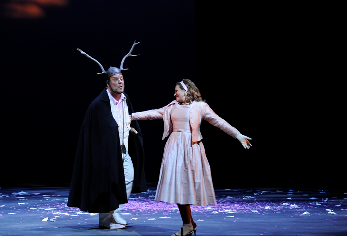 El mérito no sólo se debe a la eficaz y clara, pero también detallada actoralmente, sino así mismo a la alegre, dinámica y ágil dirección de un Alberto Zedda de eterna juventud. Como no a la presencia de una orquesta del nivel de la Sinfónica de Galicia y un reparto de auténtica clase. Bryn Terfel es, junto pero por delante de Ambrogio Maestri, el Falstaff de nuestros días. Lo demostró ampliamente a pesar de no hallarse en la misma forma de antes del verano. También los cantantes necesitan entrar en calor tras sus vacaciones. Una esporádica flema y un menor brillo vocal no empañaron una interpretación de los quilates a los que nos tiene acostumbrados uno de los mejores barítonos del presente. Ainhoa Arteta ha cantado varias veces junto a él el papel de Alice, partitura que se aviene perfectamente tanto a su vocalidad como a su presencia escénica y que no le plantea problema alguno. Magnífico también el Ford de Juan Jesús Rodríguez, todo un lujo y otro tanto hay que apuntar de la Quicky de Marianne Cornetti. Ruth Iniesta y Francisco Corujo aportaron su juventud y frescura a la pareja de jóvenes enamorados. Impecables el resto del reparto.