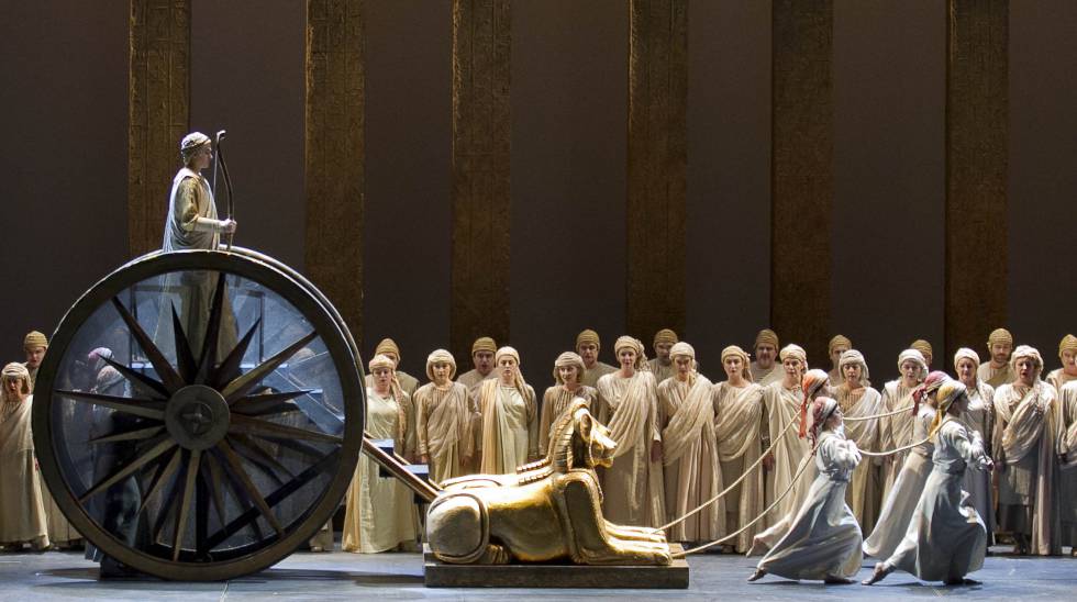 Munich ha vuelto a ofrecer la producción de la casa, que se estrenara en 1997 y que ya había tenido yo ocasión de ver en años anteriores. La producción se debe al desaparecido Herbert Wernicke y resulta poco convincente. Se podría decir que más parece una ópera en concierto que una producción escénica propiamente dicha. La escenografía ofrece un gran un plano inclinado giratorio que cierra el escenario, de modo que la acción se desarrolla siempre en corbata, excepto los dos únicos momentos en que se abre el mencionado plano inclinado: la aparición de Klytämnestra y los acordes finales. Cuando se abre la escena aparece una escalera como único elemento decorativo. En corbata no hay sino una escalera metálica a la izquierda, unida a un palco de proscenio, por donde llega Orestes, y una especie de roca a la derecha, de donde nunca se mueve Elektra.. Vestuario bastante convencional: Elektra con túnica oscura, Chrysothemis de blanco y Klytämnestra en tonos rojos, mientras Orestes lleva un traje de tiempos actuales. La iluminación tiene cierto interés, siendo todos los aspectos mencionados (escenografía, vestuario e iluminación) del propio Herbert Wernicke. Al desarrollarse prácticamente toda la acción en un espacio tan reducido, resulta muy estática.