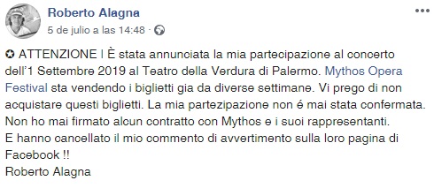 El primero advertía a sus seguidores de no comprar entradas para el concierto del 1 de septiembre en el Teatro della Verdura de Palermo. Según denuncia el tenor, el Festival Mythos Opera ha vendido entradas con su nombre en cartel durante varias semanas sin que haya existido nunca un contrato entre ambos. Además, Alagna destaca que la organización del Festival borró su comentario en el perfil de Facebook, en el que advertía de esta estafa.