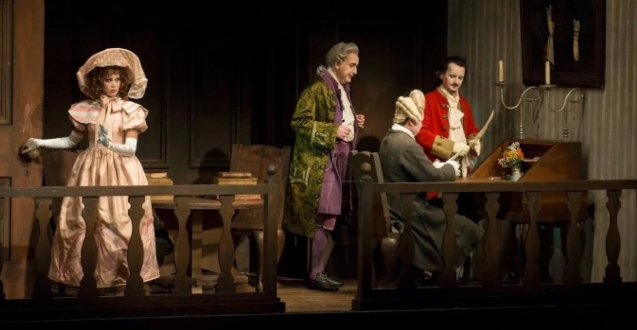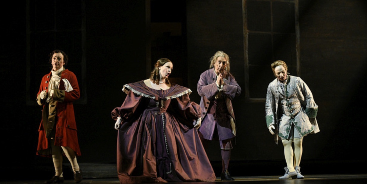 La mencionada producción escénica procede del Maggio Musicale Fiorentino, debida originariamente al británico Jonathan Miller (¡quién no recuerda su Rigoletto ambientado en Nueva York!), y repuesta aquí con dirección escénica de Daniel Dooner, con escenografía y vestuario de la británica Isabella Bywater e iluminación Jvan Morandi. La producción consiste en un escenario único en forma de una especie de Casa de Muñecas, que representa la casa de Don Pasquale, que viene a ser una recreación de aquella serie televisiva Upstairs, Downstairs. Una planta baja con hall y zona de servicio, una segunda con la habitación de Don Pasquale y el salón, y una tercera en la que vive el sobrino Ernesto. La casa se abre en el primer acto, dejando a la vista las habitaciones. La idea en sí no es mala y tiene algún apunte bien traído, como el hecho de que mientras Don Pasquale canta “Son nov’ore” descubrimos a Norina y Ernesto en la cama de éste, de tal modo que Norina canta su escena y el dúo con Malatesta en la casa de Don Pasquale, lo cual tiene poco sentido.