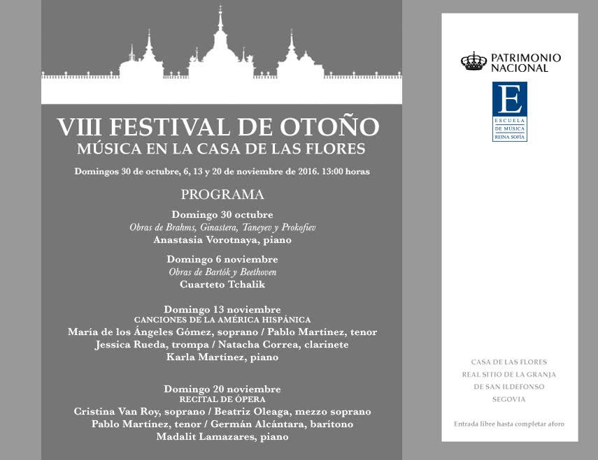 Los alumnos de la Escuela de Música Reina Sofía protagonizarán cuatro matinés dominicales entre el 30 de octubre y el 20 de noviembre, dentro de la octava edición del Festival de Otoño “Música en la Casa de las Flore”, que organiza Patrimonio Nacional en el Real Sitio de La Granja de San Ildefonso.