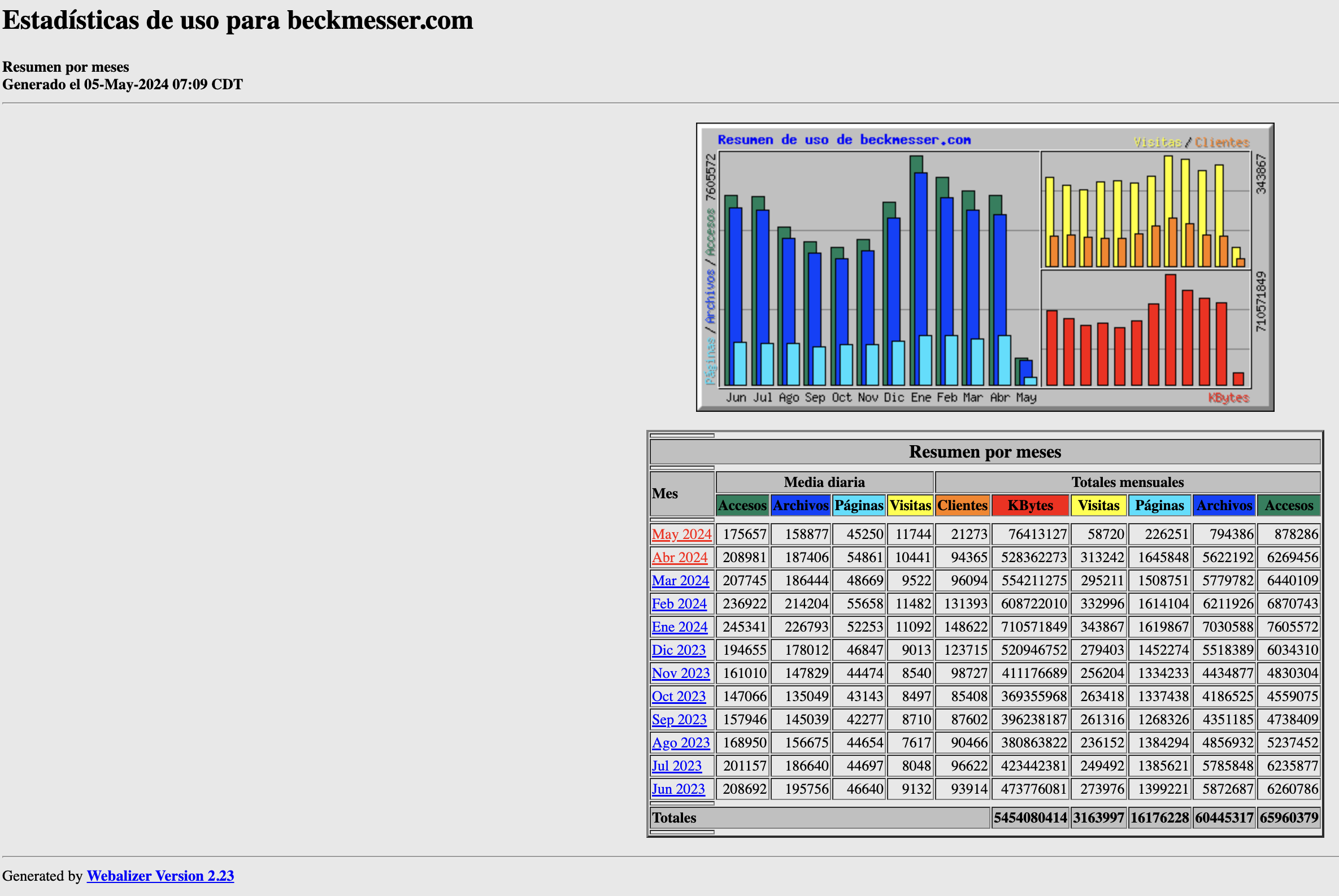Beckmesser, la web de música clásica más influyente con más de 5,75 millones de visitas en los últimos dos años y medio, obtuvo un promedio de 10.441 visitas diarias, 313.242 visitas únicas y 1.645.484 páginas leídas en marzo de 2024. Este número de páginas leídas supone un record. En Youtube cuenta con mas de 1.800 suscriptores.