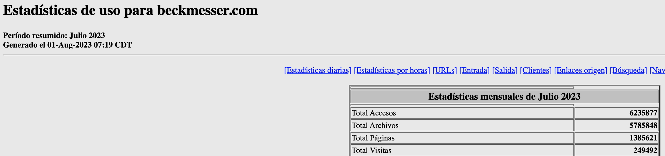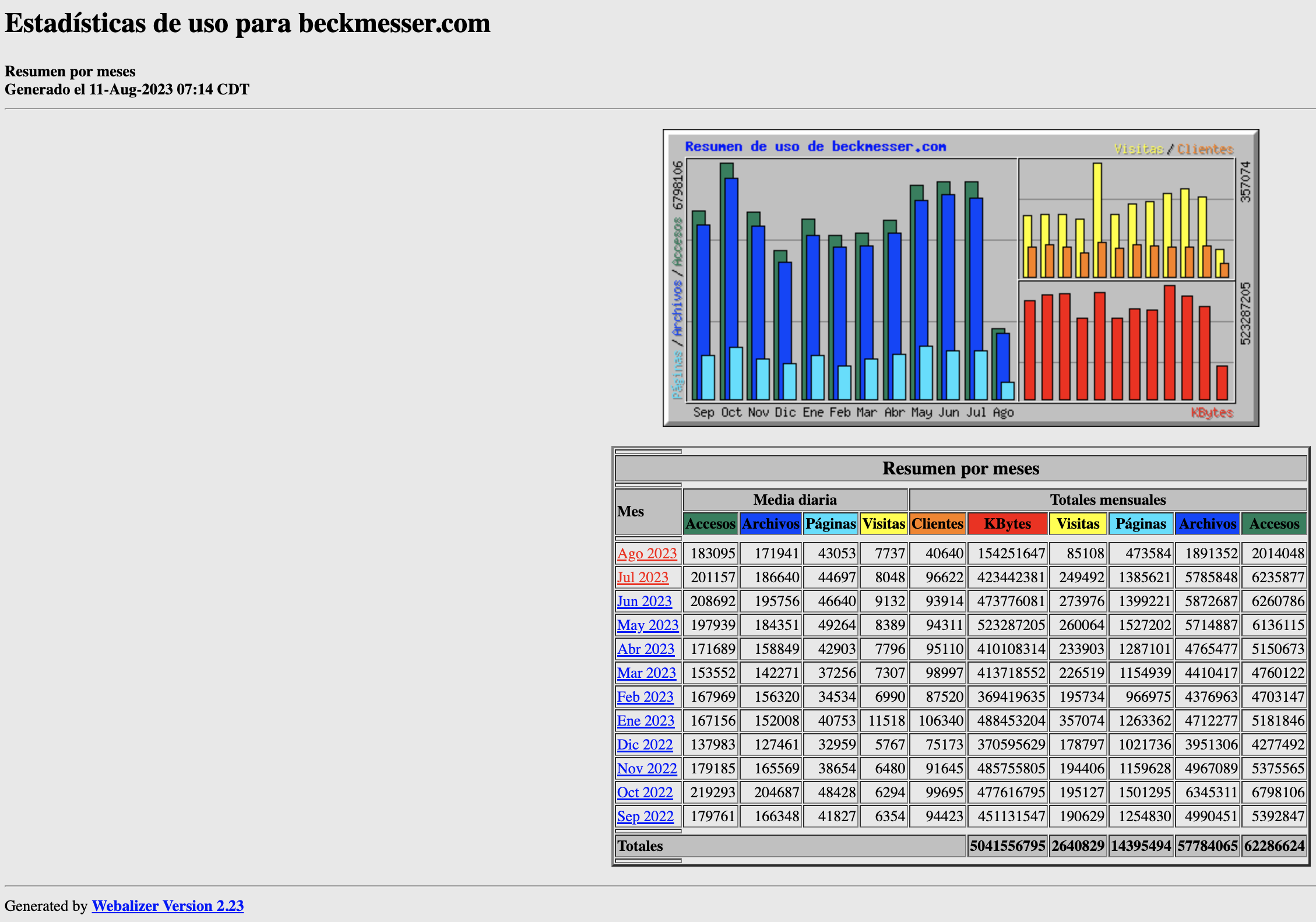 Beckmesser, la web de música clásica más influyente con más de 5 millones de visitas en los últimos dos años y medio, obtuvo un promedio de 8.048 visitas diarias, 249.492 visitas únicas y 1.385.621 páginas leídas en julio de 2023. En Youtube cuenta con mas de 1.700 suscriptores.