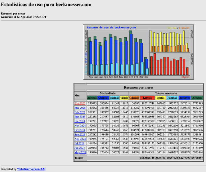 Beckmesser, la web de música clásica más influyente con más de 6,500 millones de visitas en los últimos dos años y medio, obtuvo un promedio de 11.313 visitas diarias, 350.719 visitas únicas y 2.013.055 páginas leídas en marzo de 2025. En Youtube cuenta con más de 2.200 suscriptores.