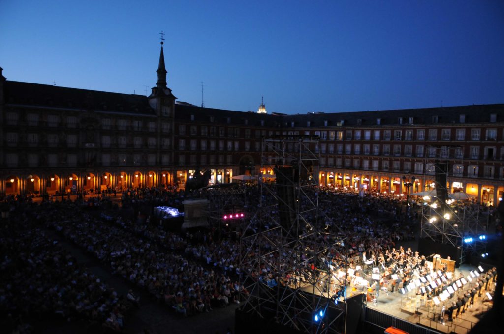 El sábado, a las diez de la noche y enmarcado dentro de la Semana de la Música, el gran escenario urbano que es la Plaza Mayor, acogerá un espectáculo musical con motivo de la celebración de su cuarto centenario, donde la Orquesta Sinfónica Bankia (OSB) será la encargada de desplegar un programa basado fundamentalmente en la zarzuela.