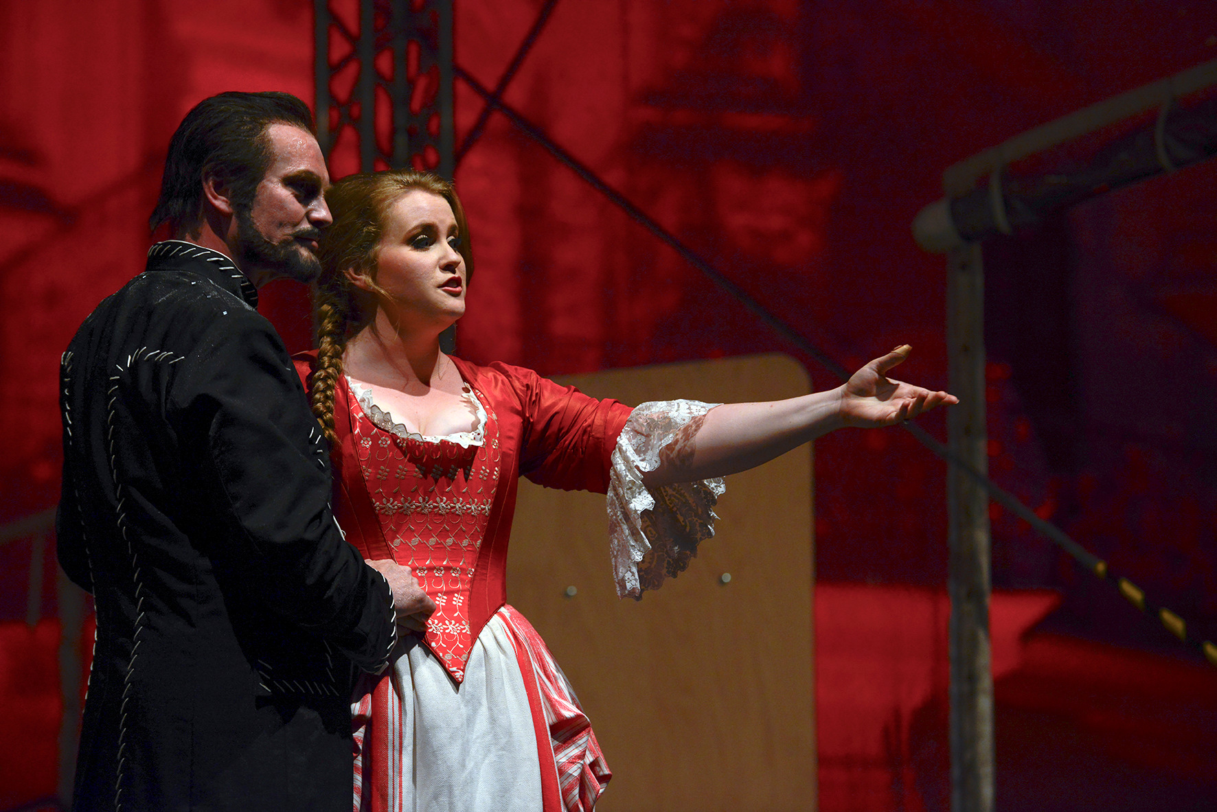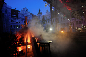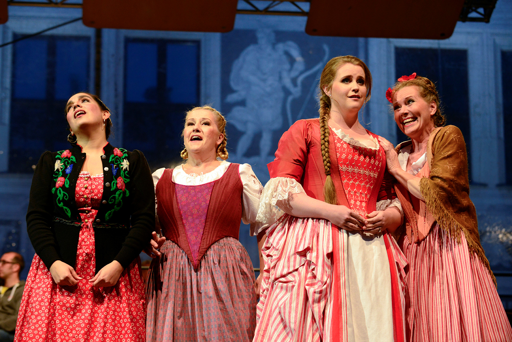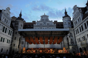 La representación estaba anunciada en versión de concierto, teniendo lugar en el precioso patio del Palacio Ducal de Dresde, una auténtica joya arquitectónica. Posteriormente, se empezó a hablar de versión semi escenificada, pero, finalmente, hemos asistido a una representación plena o casi. El trabajo que ha hecho la responsable escénica, Angela Brandt, es digno de todo elogio y posiblemente se haya abierto un nuevo camino para hacer posible óperas con presupuestos limitados, que no necesitan derroches económicos para hacerlas posibles. Es cierto que no había escenografía propiamente dicha, pero cualquiera que se hubiera puesto habría desmerecido ante la belleza del edifico en el que se sitúa el patio. Todos los artistas y el coro de niños actuaron sin partitura y vestidos con trajes típicos bávaros (excepción hecha del mago Kunrad, ataviado de negro), moviéndose con gran soltura, no solamente por el escenario elevado, en el que se situaban orquesta y coro, sino incluso por todo el patio. En este sentido hay que destacar la imaginación de Angela Brandt, al colocar hogueras en el patio y hacer uso de dobles de los protagonistas para la escena del balcón y la cesta, que se desarrollaba en el propio edificio. Incluso la iluminación funcionó perfectamente, con efectos muy bien conseguidos. La relación de producciones escénicas plenas menos interesantes que la que ahora nos ocupa sería interminable y hay que insistir en que la imaginación de Angela Brandt ha conseguido hacer de necesidad virtud, ofreciendo un espectáculo magnífico.