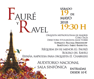Orquesta Metropolitana de Madrid y Coro Talía, junto a su directora titular Silvia Sanz Torre, cierran su temporada de abono con un concierto dedicado a música francesa titulado Fauré y Ravel. La cita es el sábado 19 de mayo en la Sala Sinfónica del Auditorio Nacional a las 19:30. Se interpretarán las dos obras más conocidas de estos dos compositores, el Réquiem en re menor y el Bolero y, además, España, rapsodia para orquesta, la obra más popular de Emmanuel Chabrier. Las entradas de 10 a 27 € ya están a la venta en las taquillas del Auditorio Nacional y en www.entradasinaem.es.