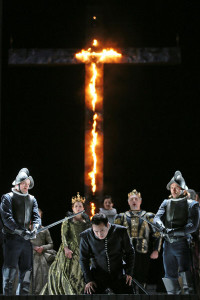 La producción se debe al británico David McVicar, uno de lo más prestigiosos directores de escena actuales, aunque su trabajo en esta ocasión no ha tenido la brillantez que suele ofrecer en otras ocasiones. La producción se estrenó aquí en el año 2007 y se caracteriza por ofrecer un escenario único para los 5 actos (es la versión de Módena), La escenografía es de Robert Jones y ofrece un escenario a base pilares laterales, siempre imitando ladrillo gris, que también ocupan el suelo, Hay un gran muro al fondo, que se levanta para las escenas de exteriores y se baja para las de interior. Una serie de elementos, siempre en ladrillo, representan ahora una tumba, luego una mesa y otras veces una pura plataforma