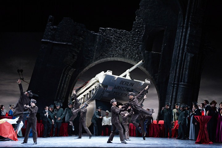 La producción escénica se ha encargado al ya veterano (80) Harry Kupfer, que hace un trabajo escénico atractivo. Traslada la acción a la Segunda Guerra Mundial, con lo que los invasores no son los polacos sino la Wehrmacht alemana, si bien Kupfer no ha querido ofrecer uniformes nazis en escena, pero sí hace que el ejército invasor cante en alemán y que en los sobre-títulos las alusiones polacas se tornen en alemanas. La escenografía se debe a Hans Schavernoch y ofrece un escenario prácticamente único con un gran arco medio en ruinas y unas grandes campanas rotas, que dan muy bien la atmósfera de guerra y destrucción. En el acto IV, el del bosque, se cubre dicha escenografía a base de iluminación (Joachim Klein) y proyecciones de videos de grandes nevadas (Thomas Reimer). En el breve epílogo vuelven a taparse con proyecciones de la Plaza Roja de Moscú. La producción funciona francamente bien, contando con un adecuado vestuario de Yan Tax. El cambio de época está bien conseguido y hay una buena dirección de escena, moviendo de manera adecuada a las masas.