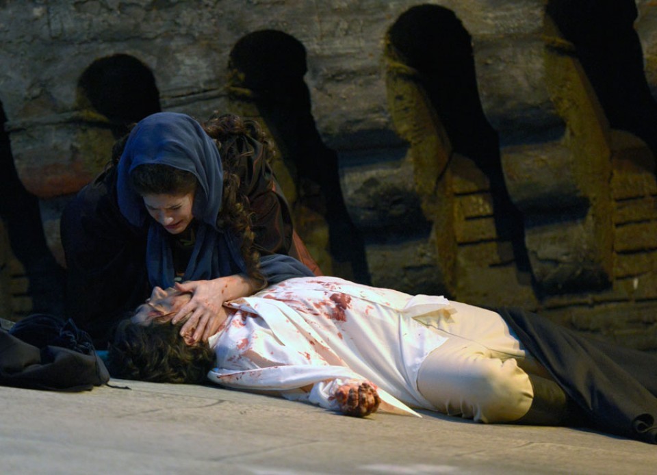 La Deutsche Oper ha vuelto a poner en escena la producción del ya desaparecido Boleslaw Barlog, que llega con ésta nada menos que a 381 representaciones. Ha cumplido la cifra espectacular de 47 años y bueno será recordar que en su estreno Tosca fue la siempre recordada Pilar Lorengar. Un auténtico prodigio de longevidad. Estamos ante una producción de las que hoy no se llevan, es decir escenarios realistas, vestuario de la época en la que se desarrolla el drama y ni la más mínima provocación. En la escenografía de Filippo Sanjust no falta nada: la Madonna en una columna (como dice el libreto), la pila y la capilla en el primer acto. Por supuesto, el crucifijo y los candelabros en el segundo, y, finalmente, la terraza, el ángel y la vista a lo lejos de San Pedro del Vaticano en el tercero. El vestuario lleva la firma del mismo Filippo Sanjust y es el visto tantas veces, destacando el de Floria Tosca, que fue estrenado hace casi 4 años para el debut de Anja Harteros en el personaje. Una producción del mayor de los clasicismos, especialmente recomendada para nostálgicos, aunque no tiene el brillo de las de Franco Zeffirelli.