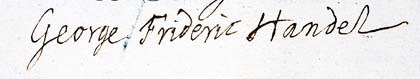 Parece que el maestro ya adoptó su nombre al inglés desde su llegada al Reino Unido en 1711. Pero, sin lugar a dudas, desde 1727, año de su segundo nacimiento, esta vez como británico, cambió su grafía por Handel, e incluso su nombre por el de George Frideric, como podemos ver en su firma más arriba.