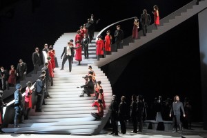 Como digo, se ha ofrecido una nueva producción, que lleva la firma de Andrens Dresen, que ha ofrecido cosas interesantes y provocaciones gratuitas y sin sentido. La acción se trae a tiempos más modernos que los señalados por el libreto. Estamos seguramente en los años 30. La escenografía de Mathias Fischer-Dieskau ofrece un escenario giratorio dominado por una inmensa escalera blanca, que está presente a lo largo de toda la ópera. Esta gran escalera permite sacar un gran partido al escenario, ya que la acción se desarrolla en el acto I debajo de la misma (habitación de hotel de los Waldner) y en el resto de la ópera tanto en la gran escalera, con todo el gran espacio que permite, como debajo de la misma. La verdad es que me ha parecido una escenografía atractiva y que ofrece muchísimas posibilidades escénicas, aparte de que una gran escalera es consustancial con esta ópera. El vestuario de Sabine Greunig es muy atractivo en el caso de Arabella y juega con colores negros en los invitados al baile del segundo acto y con el rojo en el caso de las invitadas, en un contraste muy bien conseguido con el blanco de la escalera. Buena también la iluminación de Michael Bauer.