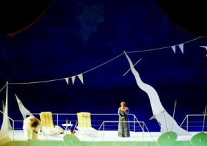La escenografía y el vestuario se deben a Johannes Leiacker. Sus dos primeros actos son un tanto naíf y hasta infantiles, como si nos contaran un cuento, desarrollándose el primer acto en la cubierta de un barco, con hamacas modernas y vestuario de época, mientras que en el segundo nos traslada a un escenario cerrado por unos telones pintados con árboles, que me recordaban mucho a la producción de Steingraber, que se pudo ver en el Liceu de Barcelona hace unos años. En el último acto pasamos del ambiente naíf a una habitación reducida, donde se desarrolla todo el monólogo de Tristán. La llegada de Isolde la resuelve Konwitschny de una manera un tanto discutible, en función de la interpretación que se le quiera dar, pero siempre interesante. Efectivamente, Tristán muere en brazos de la recién llegada Isolde, para poco más tarde incorporarse y salir del escenario reducido con ella, quedándose en la parte delantera, mientras que detrás se desarrolla la lucha de los recién llegados y el perdón del Rey Marke. Yo entiendo que lo que Konwitschny hace es que muera también Isolde y que ambos protagonistas abandonen el mundo (el escenario reducido), cerrando ellos mismos el telón, ya que han dejado de pertenecer al mismo, siendo el Liebestod un canto desde el otro lado de la muerte, tan ansiada, por otro lado, por los protagonistas. De hecho, en los últimos compases vuelve a abrirse el teloncito para mostrarnos al Rey Marke y a Brangaene velando dos ataúdes blancos. La iluminación de Michael Bauer tiene mucha importancia en esta ópera, al jugar el propio libreto con luz y oscuridad. Está muy bien resuelta. Es una producción que tiene interés.