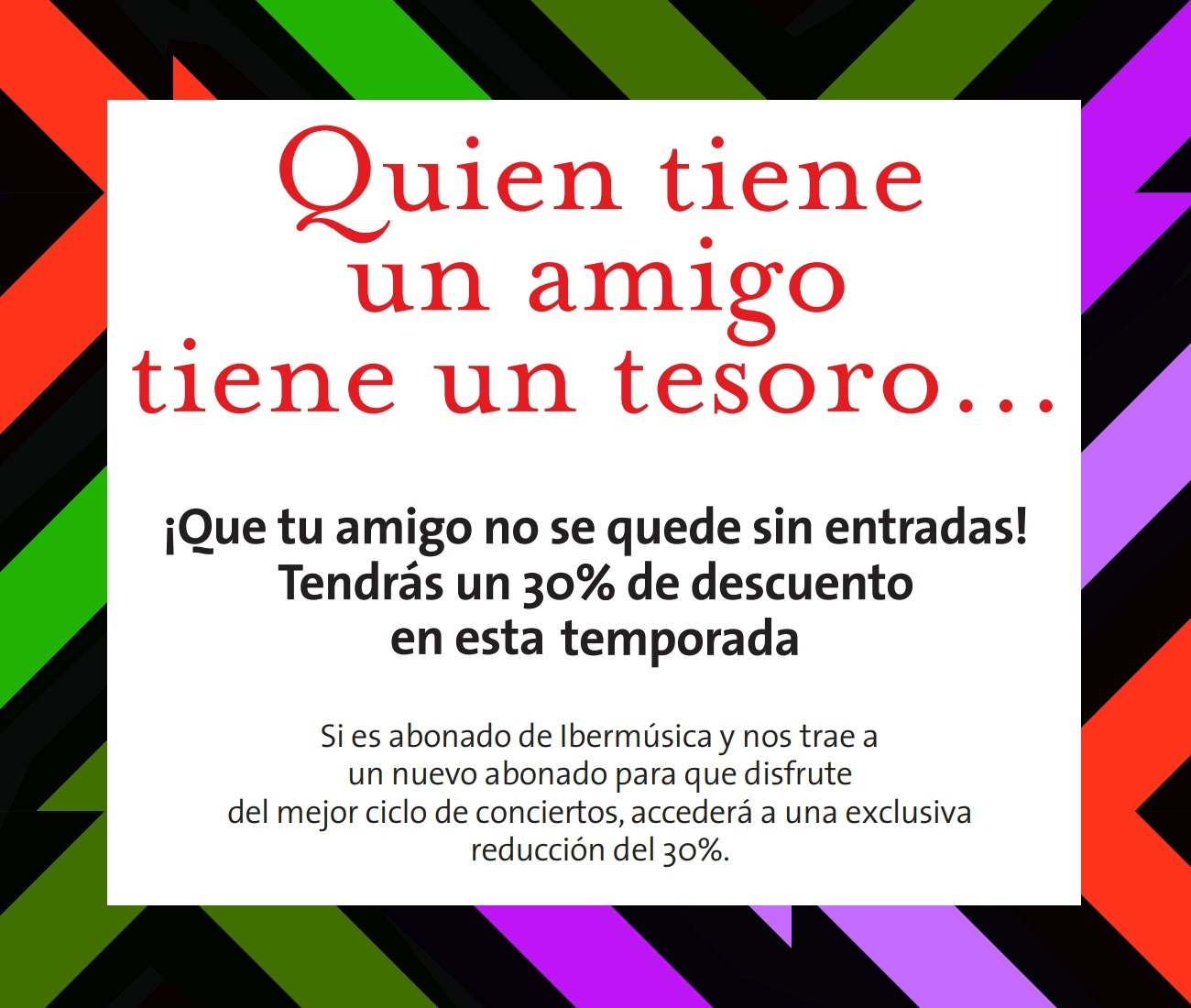 Tras el periodo de renovación de abonos, Ibermúsica ha abierto una nueva campaña de bienvenida en agradecimiento su confianza a los abonados. ‘Quien tiene un amigo tiene un tesoro…’ invita a los compañeros de los abonados a beneficiarse de un 30% en el precio del abono.