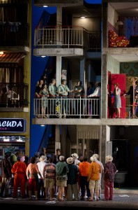 Damiano Michieletto ha conseguido convertirse en uno de los directores de escena más cotizados en poco tiempo. Sus producciones suelen estar llenas de colorido y buenas dosis de imaginación para mover la acción a tiempos actuales, manteniéndose fiel a la música y el libreto. En lo que a esta ópera se refiere, hay que señalar que hay dos producciones suyas de la ópera de Rossini y ambas están coincidiendo en el tiempo. La que llega a Valencia procede de Ginebra, donde se estrenó, inaugurando la temporada de ópera de la ciudad suiza en Septiembre de 2010, habiendo sido repuesta nuevamente en la temporada actual. La otra se ha representado este año en varias ciudades italianas y no ha sido muy bien recibida, ofreciendo la ópera como un viaje de los personajes. Michieletto trae, en la producción que nos ocupa, la acción a un barrio popular de la Sevilla actual, ofreciendo un escenario giratorio (Paolo Fantin), que muestra por un lado una fachada con ventanas y balcones, con vecinos tomado el fresco y la colada en los tendederos, mientras que en el interior vemos la casa de Don Bartolo con tres alturas, en forma de una especie de casa de muñecas y unas escaleras que comunican las habitaciones. El vestuario de Silvia Aymonino es colorista y juvenil, especialmente divertido en lo que se refiere a la jovencita Rosina y a un Conde Almaviva ligón y aficionado a las motos y los coches de gran cilindrada. Correcta la iluminación de Fabio Barettin.