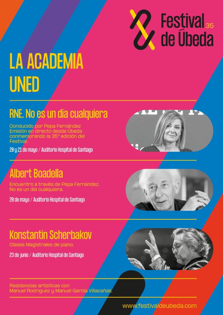 Además, el Festival de Música y Danza contará un año más con ‘La Academia’, su apartado más académico enfocado a la formación y divulgación que cuenta con el apoyo de la UNED. Aquí se incluye la emisión a nivel nacional del programa ‘No es un día cualquiera’ que dirige Pepa Fernández en Radio Nacional de España, el citado encuentro con Albert Boadella y unas clases magistrales del pianista Konstantin Scherbakov, quien hace unas semanas ya estuvo en el auditorio del Hospital de Santiago grabando en audio y video, para una iniciativa internacional, la obra completa para piano de Rachmaninov. Algo que fue posible gracias a la participación en el proyecto del Festival ubetense.