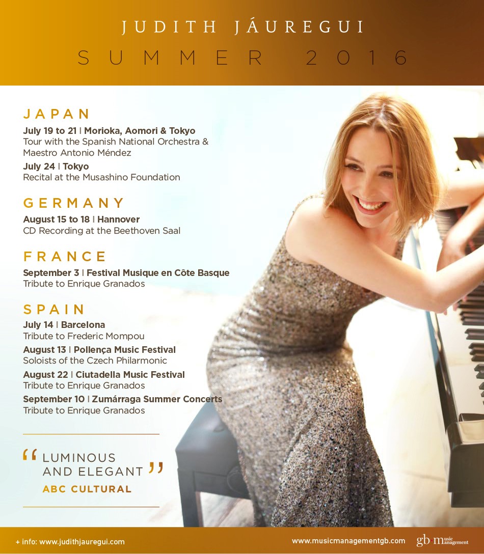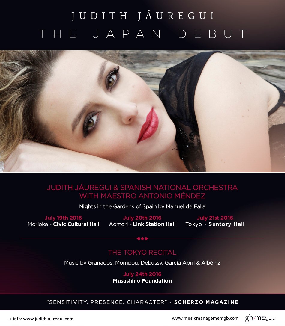 Los días 19, 20 y 21 de julio será su debut en Japón junto a la Orquesta Nacional de España y con ‘Noches en los jardines de España’ de Manuel de Falla como carta de presentación. Los conciertos, en los que también participará el guitarrista Pablo Sáinz Villegas interpretando el ‘Concierto de Aranjuez’ de Joaquín Rodrigo, serán en Morioka, Aomori y en el emblemático Suntory Hall de Tokio. El maestro Antonio Méndez estará al frente de la ONE, que completará el programa con ‘El sombrero de tres picos’ de Falla y ‘Capricho español’ de Rimsky-Korsakov. Jáuregui volverá a actuar en Tokio el día 24 de julio con un recital de piano solo que ofrecerá en la Fundación Musashino con música de Granados, Mompou, Debussy, García Abril y Albéniz.