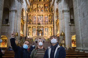 Segunda parada. El Monasterio, entrando no por donde el turismo sino por la Puerta de los Reyes, frente a las ventanas de la casa de Teresa Berganza, a quien le enviamos un cariñoso mensaje. Los visitantes pudieron ver la supuesta última piedra, no de piedra sino de oro. “Se acabó la piedra, pero aún sobró oro” según el