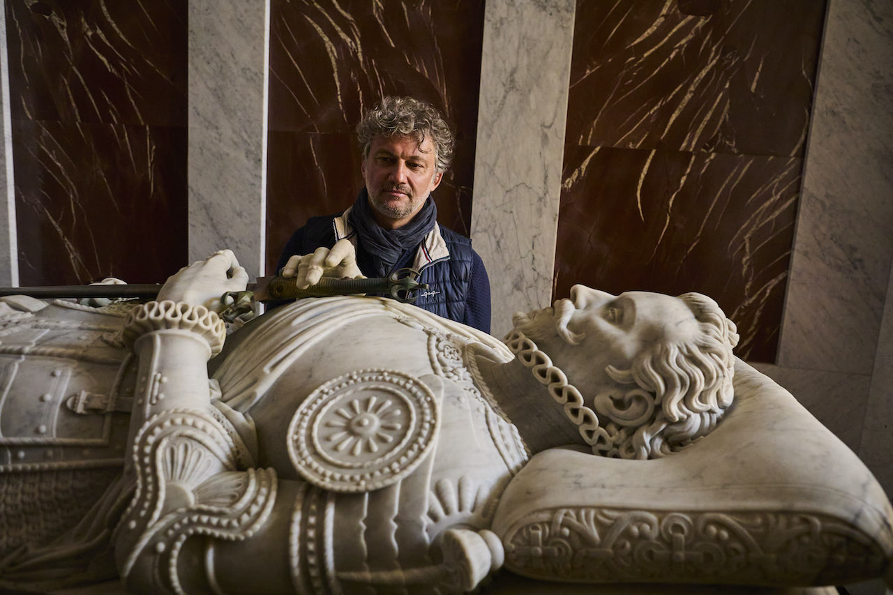 Jonas Kaufmann ante la tumba de Don Carlos en el Monasterio de San Lorenzo de El Escorial. Foto: Alberto R. Roldán