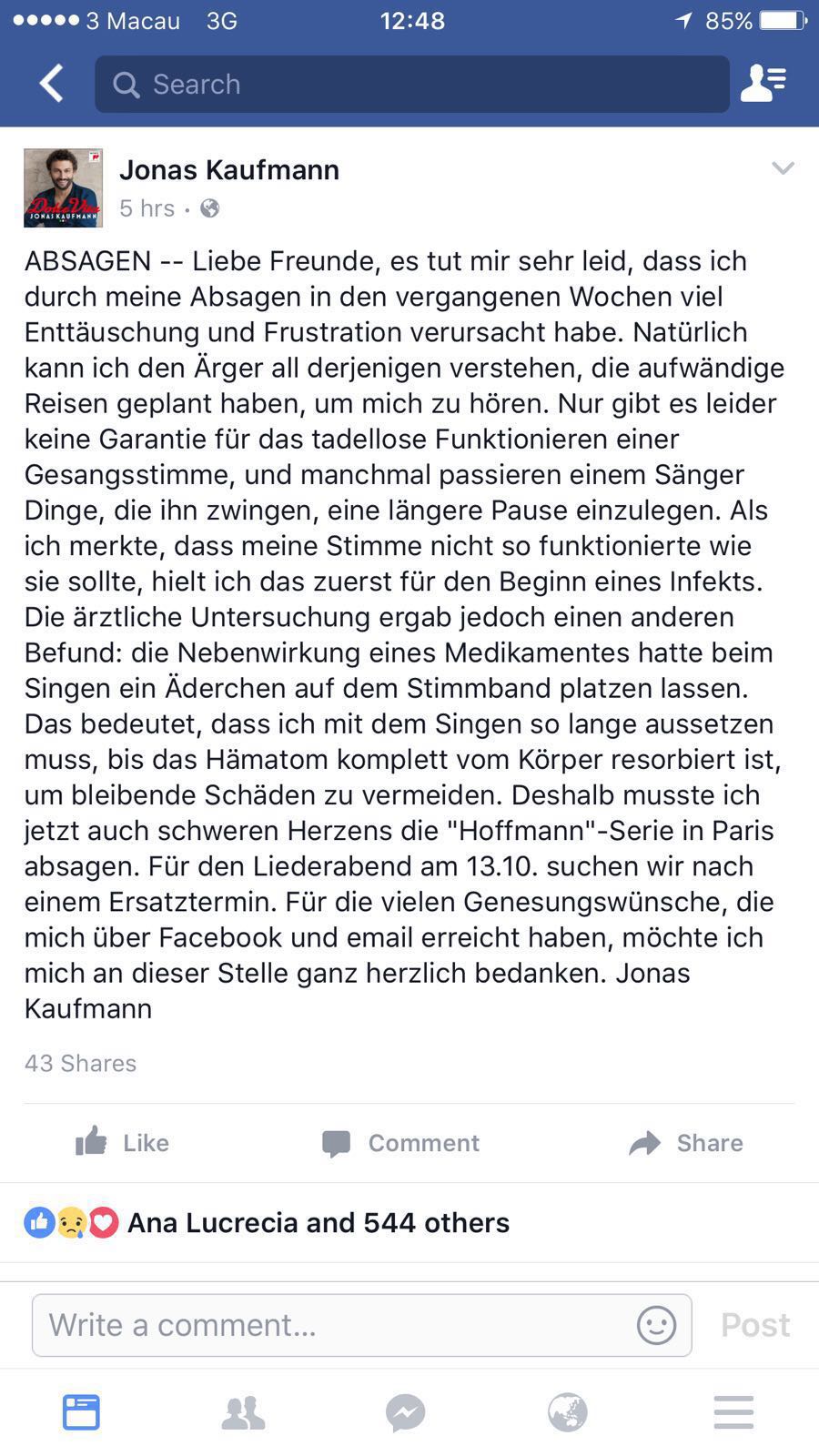 “Siento que mis cancelaciones han sido la fuente de mucha decepción y frustración en las últimas semanas. Por supuesto, puedo entender la irritación de todos los que organizaron viajes costosos para venir a escucharme. Por desgracia, el rendimiento de la voz del cantante no se puede garantizar, ya que a veces un cantante se enfrenta a circunstancias que le requieren tomar un largo descanso. Cuando me di cuenta de que algo no estaba bien con mi voz, pensé en un primer momento un inicio de infección. Sin embargo el examen médico ha dado otro resultado: los efectos secundarios de un fármaco han roto una vena pequeña en mis cuerdas vocales. Así que tengo que dejar de cantar hasta que el hematoma sea absorbido por completo para evitar daños irreversibles. Así es con gran tristeza, tengo que cancelar mi actuación en Los Cuentos de Hoffmann en París. Quiero agradecer aquí a todos los que me han enviado sus buenos deseos a través de Facebook y correo electrónico”.