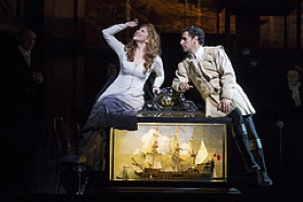 El Covent Garden ha ofrecido una nueva producción, que lleva la firma del británico John Fulljames, cuyo resultado ofrece ideas interesantes, pero acaba resultando un tanto monótono y confuso. Esta ópera, cuyo libreto está basado en el poema de Walter Scott, no es sino la visión que en la Inglaterra del siglo XIX se tenía de la casi desconocida Escocia, brumosa y romántica. De aquí arranca John Fulljames con una primera escena, que se desarrolla en un Museo en el siglo XIX, en el que podemos ver una serie de vitrinas, entre las que se ve la figura romántica de la Donna del Lago. Entre los visitantes del museo se encuentran Walter Scott y Rossini, que durante la ópera asumirán los personajes de Serano y Albina. Son ellos los que abren el telón del fondo para que la acción propiamente dicha comience, en un escenario gitatorio, que ofrece un muro por un lado y una gran escalera en espiral en el otro. Esta escenografía (Dick Bird) toma otras formas parecidas en la segunda parte de la ópera, convirtiéndose en una sala del parlamento para la escena final. El vestuario de Yannis Thavoris combina bien el vestuario del XIX con los típicos escoceses del XVI. El ambiente general de la producción es nocturno, haciendo Bruno Poet una buena labor en la iluminación.
