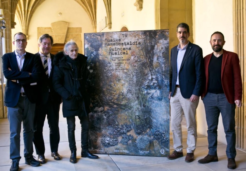 Al acto asistió el pintor Juan Luis Goenaga, uno de los máximos exponentes del expresionismo vasco y creador del cartel para la Quincena Musical. En la obra predominan los colores terrosos, pétreos y oscuros, si bien en la zona superior central sorprende un fogonazo en tonos amarillos: “a la hora de pintar utilizo todo tipo de herramientas que puedo tener a mano, desde trozos de carbón a palos, cuerdas… Las manos y los pies también los utilizo mucho; para mí son herramientas habituales de trabajo “.