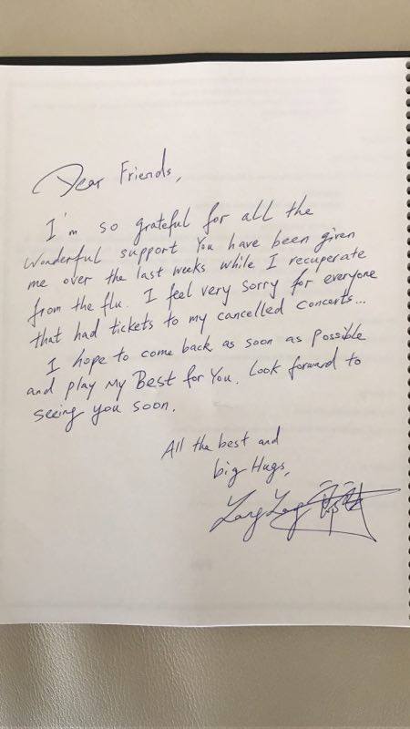 Recientemente, la estrella del piano tuvo que cancelar otro concierto en la sala de conciertos de Hamburgo por un catarro… pidió excusas en su página.