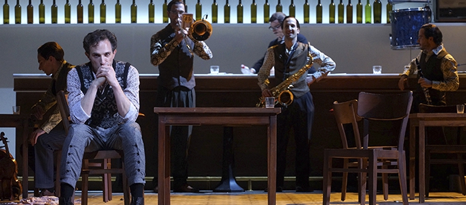 Es difícil seguir el hilo, tanto más cuanto que la megafonía es muy defectuosa; como la pronunciación de algunos actores-cantantes. Todo se desarrolla a lo largo de quince escenas sobre un decorado único, con una barra de bar como centro (en imagen, nos apuntó una espectadora, que recuerda ciertos cuadros de Hopper). La dimensión irreal, metafórica, de las historias se refuerza por la integración de la música en la acción sobre el escenario. Allí se dan cita piano, clarinete, saxo, trombón, chelo y violín, que sirven de base y soporte general a un foso de once profesores y a un grupo, situado en el palco real, de siete, que, opina Schubbe, puede ser una imagen del río de los cuentos de Onetti.