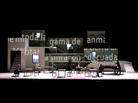…La escenografía de Bettina Meyer lo representa con enorme eficacia a partir de una construcción de recta arquitectura con varias alturas en derredor de un bar. Ya en el arranque grandes textos iluminan la escena, como volverán a hacerlo posteriormente, casi sugiriendo la importancia de la palabra recitada. Es la gran protagonista. Lo será a lo largo de toda la obra dejando en el aire esa incómoda sensación de imposibilidad frente a lo vocal contra la que ha luchado tantas veces el viejo teatro musical contemporáneo.