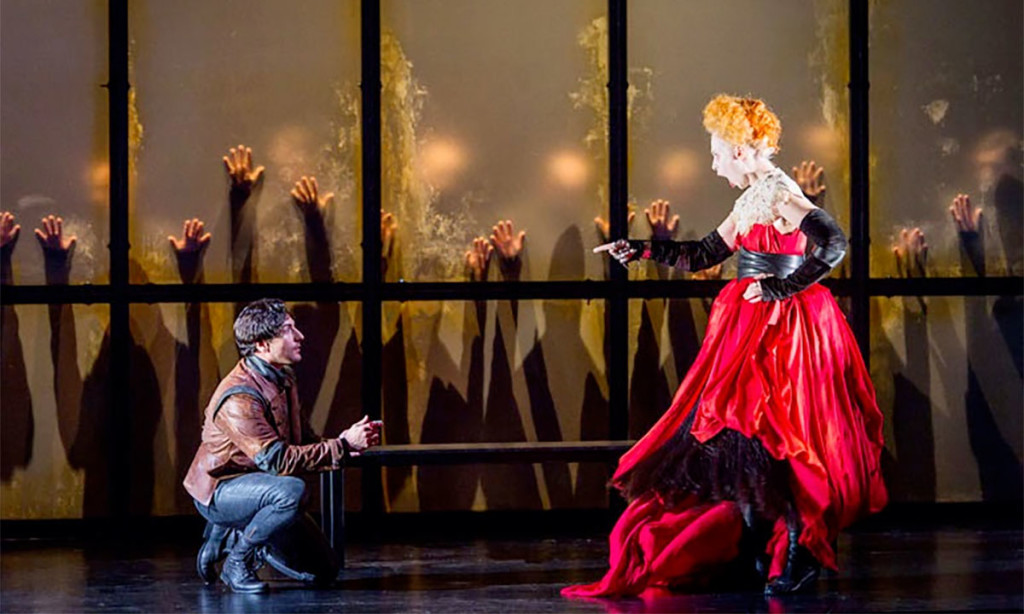 No puede hablarse de reto cuando, una temporada más, se recurre a una producción alquilada para su apertura. Detalles como éste revelan en qué división juega realmente un teatro. La producción de la Welsh National Opera de Cardiff (2013) resulta extremadamente oscura, casi tanto como la serie de la BBC “WolfHall”; a causa de los decorados y el vestuario, negros excepto en uno de los bujes de la reina, de color rojo. Hay poco que contar, ya que la trama es simple, y la regia no lo hace con excesiva imaginación pero tampoco embarulla como otras muchas veces. Naturalmente había que poner los «detalles» de firma, así una insinuada violación o el trono de Isabel simulando una araña. La cosa no da para más comentarios.