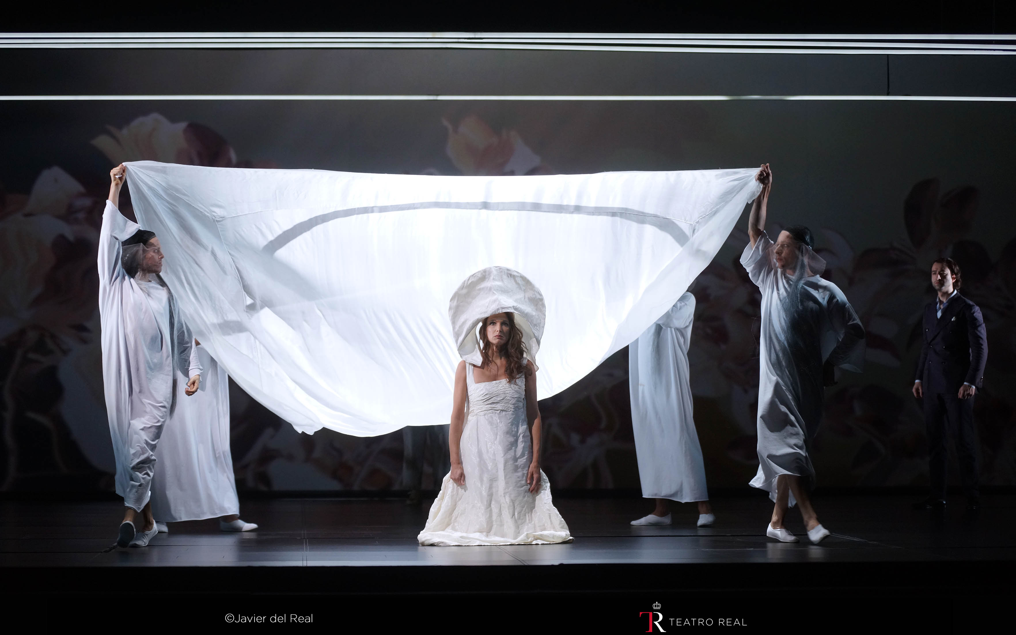 Los boquetes dramatúrgicos de Bomarzo podrían disimularse con una puesta en escena vívida e imaginativa, que nos permita sumergirnos en las reminiscencias teñidas de pesadillas del protagonista, pero Pierre Audi ha optado, en cambio, por huir de todos los asideros visuales y abrazar el esquematismo y la abstracción, ya anunciados en esa inmensa y desnuda caja negra que acoge en su inicio al protagonista, presagio de una propuesta huera que llama la atención por su alarmante pobreza de ideas, ya desde el preludio instrumental, que Ginastera ubica en las catacumbas de la orquesta (contrabajos, bombo, trombones, contrafagot) y que se toca en gran parte a telón bajado. El desolado paisaje lunar que alterna con esas paredes desnudas carece también por completo de referencias barrocas y los personajes deambulan por él como zombis. Apoyadas en el uso frecuente de unos vídeos pedestres y amusicales de Jon Rafman, las escenas van sucediéndose sin más ilación que la presencia reiterada en el escenario de las siete edades de Pier Francesco Orsini, desde su infancia a su vejez, y de tubos de luz fluorescente que, aislados o formando figuras geométricas, van y vienen sin ton ni son. La secuencia de analepsis que integran la ópera apenas da lugar a elementos diferenciadores, lo que acentúa aún más la estructura desgalichada del libreto, sin perfiles ni recorridos psicológicos de interés. El vestuario ecléctico e incongruente (¡pobre Thomas Oliemans, mudado de momia en sin techo como el astrólogo Silvio de Nardi de uno a otro acto!), la pobreza escenográfica y, sobre todo, esos fugaces movimientos espasmódicos de los bailarines presentes en ambos actos recordaron a algunas señas de identidad tristemente habituales en este teatro en tiempos recientes.