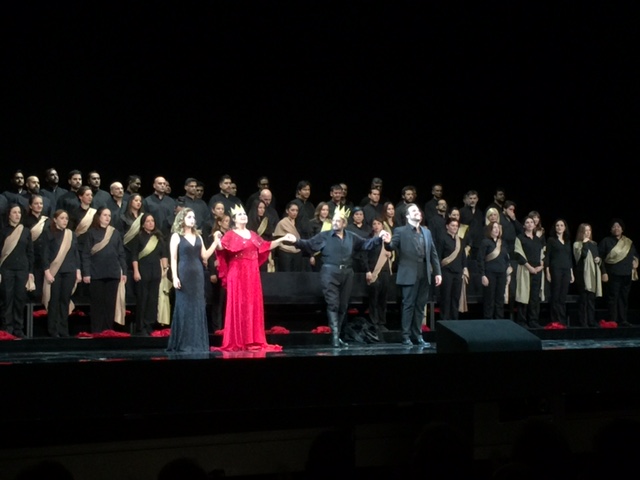 Anna Pirozzi fue una brava lady Macbeth desde una arrebatadora “Vieni, t’affretta”, página con cabaleta muy difícil, que resolvió como pocas pueden hacerlo hoy y que fue aplaudida pero no tanto como merecía. Tiene una ligera tendencia al grito, pero canta el papel y recordemos que el mismo Verdi quería una voz especial para la soprano. A menor, pero gran nivel también, sus otras dos arias, con sobreagudo limpio. El joven tenor, Brian Jagde proviene del concurso Operalia y seguramente fue un “consejo” de Domingo incluirlo en el reparto. No se equivocó, pues logró una de las mayores ovaciones de la noche por su entrega sin reservas como Macduff y una voz interesante. A la de Ildebrando d’Arcangelo, que canta con gusto, le falta peso para Banco y el personaje se queda corto en la gravedad de su aria. Correcto el resto del reparto.