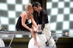 La producción escénica lleva la firma de Emilio Sagi y es la que se pudo ver en el Festival de Pésaro en las dos ocasiones aludidas. Siempre he creído que Sagi está como pez en el agua en este género bufo y lo ha demostrado una vez más. La producción cuenta con una escenografía simple y colorista de Franceso Calcagnini y un vestuario divertido y atractivo de Pepa Ojanguren. A todo ello hay que añadir una buena iluminación por parte de Eduardo Bravo. Emilio Sagi lleva la acción a los años 70, con una Ernestina desenfadada y libre, un Buralicchio convertido en un play boy amanerado y un Gamberotto dedicado a a los negocios de import-export. La escena funciona francamente bien, aunque no sea nada fácil sacar partido de lo que acontece en el libreto durante el largo primer acto.