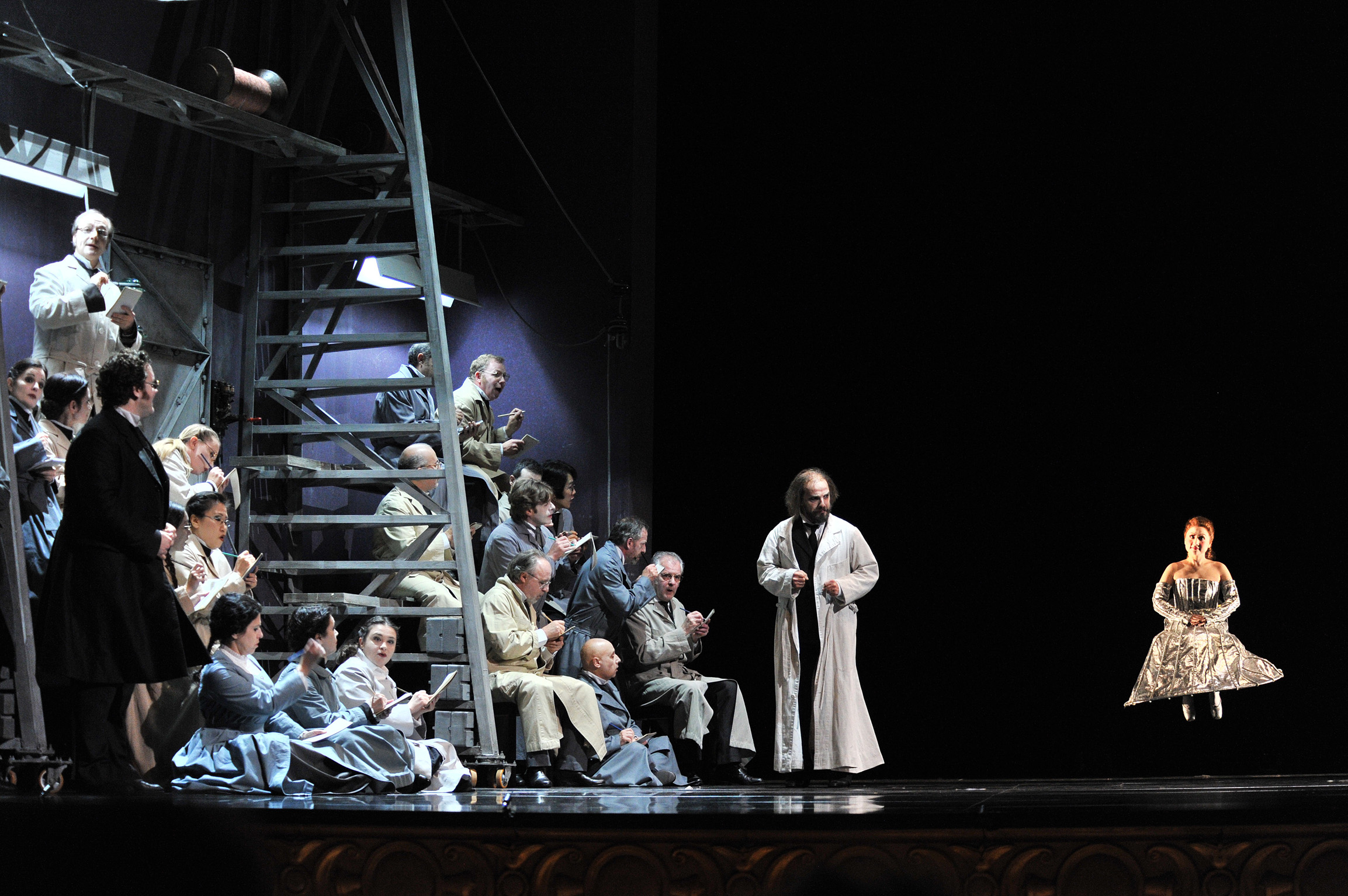 El Liceu ha ofrecido una nueva producción del francés Laurent Pelly, en coproducción con San Francisco y Lyon. Pelly es un director de escena que ha cosechado importantes éxitos en sus producciones de La Fille du Regiment y de Manon y siempre se tienen grandes expectativas ante sus trabajos. En esta ocasión las expectativas han venido seguidas de decepción, como tantas veces ocurre. Narra la historia en un ambiente oscuro y gris, privando a la escena de todo colorido, lo que se puede entender en el acto de Antonia, pero no en los demás y, particularmente, en el de Giulietta. La escenografía de Chantal Thomas ofrece una serie de paneles reversibles, cuya facilidad de movimientos consigue que los cambios de escena tengan una gran rapidez, pero no mucho más interés ofrece. De hecho, lo que ocurre es que la facilidad de movimientos de los decorados hace que los cambios de escena sean casi continuos, llegando a cansar tanto movimiento. En general, son escenas de interior, con paredes cerradas. El vestuario se debe al propio Laurent Pelly y responde a la época del estreno de la ópera (1881) y resulta poco atractivo. Lo más conseguido de la producción consiste en los movimientos de la muñeca Olympia, tanto en su arranque en una cesta de una gran grúa (tipo la Fura dels Baus en la tetralogía de Valencia) como en sus evoluciones posteriores, patinando en su dueto con Hoffmann. A esto habría que añadir el notable juego que saca Pelly a las apariciones sorpresivas del doctor Miracle en el acto de Antonia. Por el contrario, el Prólogo, Epílogo y, sobre todo, el acto de Giulietta, resultan muy poco interesantes. Finalmente, la iluminación de Joël Adam funciona bien, aprovechando el ambiente oscuro de toda la producción. No deja de ser una originalidad gratuita hacer que Hoffmann mate a Giulietta al final del acto de Venecia.