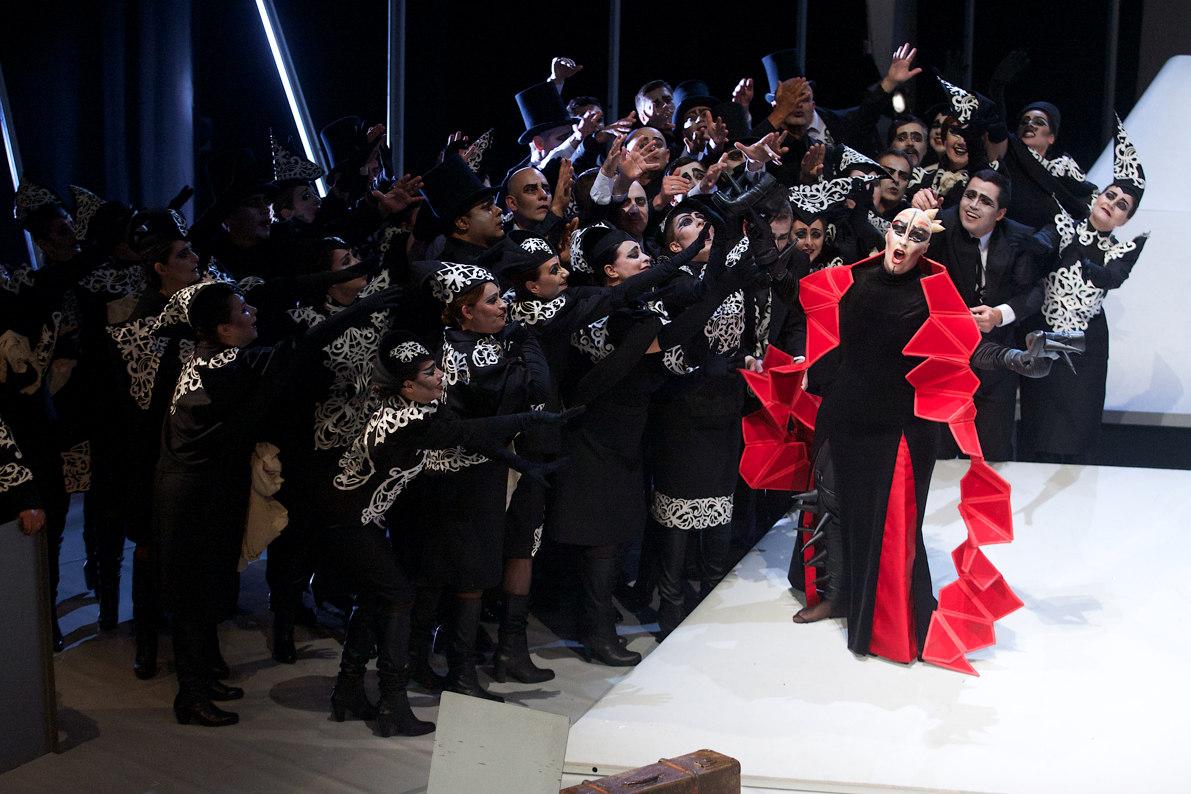 Aunque la mayor sorpresa de la noche habría que buscarla en los resultados conseguidos por el resto del reparto, todos ellos portugueses que, lejos de desmerecer frente a la pareja protagonista, dieron una lección general de interpretación y disciplina actoral. Incluída la vocalización en inglés, más ajustada que la de Katajala, que mostraba algunos latiguillos propios de las latitudes de influencia germánica. Empezando por el barítono Luis Rodríguez, que diseñó un malévolo Nick Shadow de perfecta intención. Junto a él, la mezzosoprano Cátia Moreso, divertida como seductora Mother goose, la bella y opulenta dueña del burdel donde transcurre la segunda escena, o la también mezzo Maria Luísa de Freitas, encarnando el papel-fetiche de Baba La turca, ejecutado en la línea ambigua de Lindsay Kemp. Aunque la palma se la llevaría el lujoso cameo del veterano tenor Carlos Guilherme, creando un clima muy especial como subastador. Todos ellos, respaldados por un coro excepcional, entregado al desarrollo de la acción.